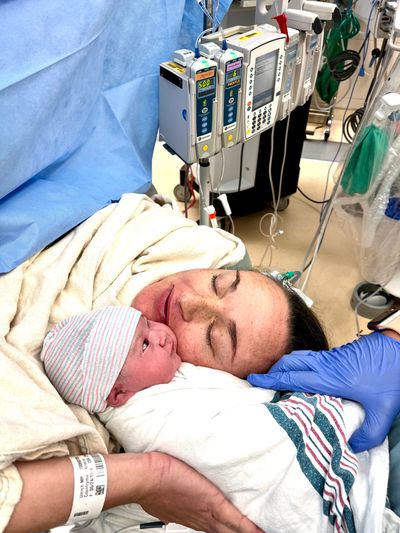 Baby Margaux studies the c-section equipment while mama Kristina snuggles.
