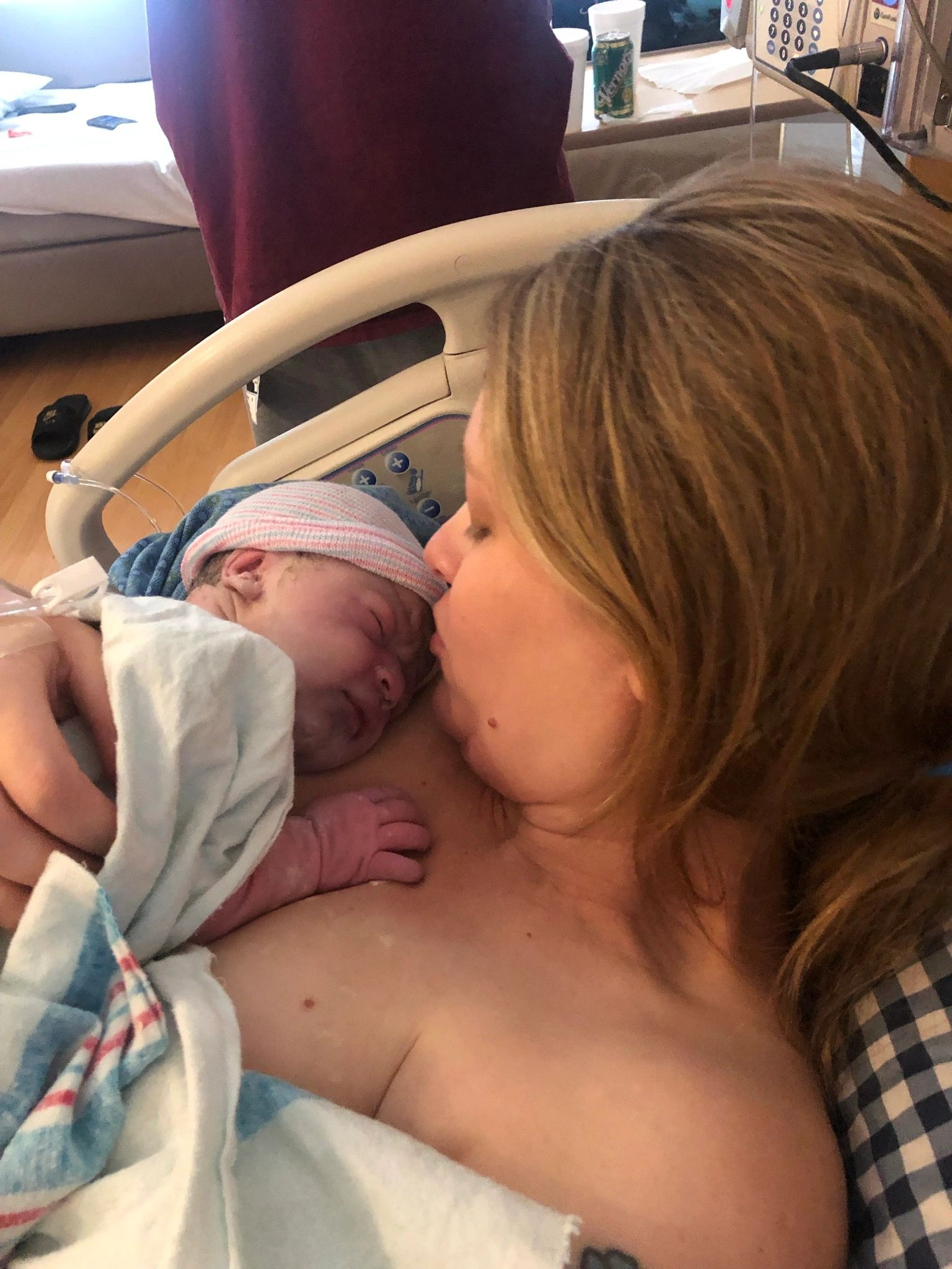 Meg H and her new family finally rest and bond after her 40-hour natural labor and birth..